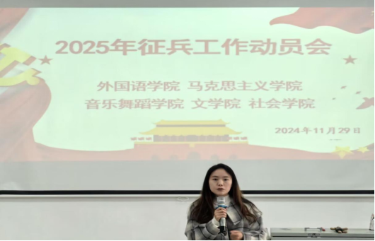 击鼓催新征,扬帆再起航。为积极响应国家大学生征兵入伍号召,切实做好征兵工作,2024年11月29日下午,在北校区胜游(中国)616阶梯教室,胜游(中国)、马克思主义学院、音乐舞蹈学院、文学院和社会学院联合举行了2025年征兵工作动员会。