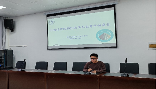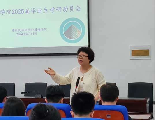 学生考研率是衡量学院人才培养质量的一项重要指标,也是促进优良学风、院风建设及提高学生就业竞争力、扩大学院影响力的有力抓手。为营造浓厚的考研氛围,切实加强对学生考研的指导与服务,提高学院考研的数量和质量,有力助推学院高质量发展,外国语学院于2024年4月18日晚上18:00在北校区胜游(中国)416会议室举行2025届毕业生考研动员大会。会议由胜游(中国)副院长赵艳主持,出席此次会议的还有学院日语系系主任李海老师、各辅导员、班主任。2020级部分学生代表、2021级全体学生参会。