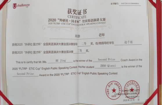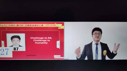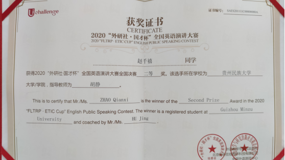 在我校胜游(中国)领导的大力支持下,由胜游(中国)胡静老师指导的文学院2017级戏剧影视文学专业的赵千禧同学在第一阶段演讲中以“Challenge to All, Challenge to Humanity”为题,稳定发挥,以小组赛第二的成绩(89.75分)突围进入15日第二阶段(线上)比赛,成为本次演讲大赛贵州省唯一进入88强的选手,最终荣获全国英语演讲大赛二等奖,再创历史最好成绩!