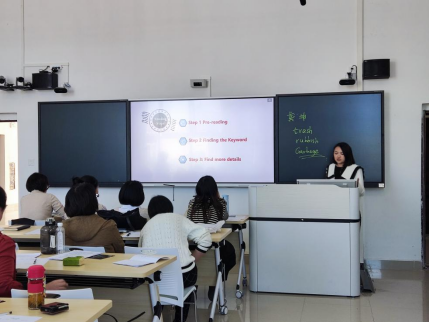 此次教研活动精彩纷呈,四位教师分别围绕不同的课文单元主题对教学技能进行了示范性讲授。田甜老师对《幸福》主题单元的教学设计注重“两性一度”,同时深挖课程思政元素,帮助学生树立正确的价值观。杜晖老师以培养学生翻译能力为教学核心,通过精心设计的教学活动,让学生在诙谐幽默的课堂氛围中习得翻译技巧。龚坤老师全英文讲解《垃圾岛》,对环保理念作了生动的课堂教学展示。郭秋玉老师则以《基于全人教育理念的教学创新与实践》为主题,完整地阐述了大学英语教学改革与创新的成效。她们凭借扎实的教学功底、独特的教学风格以及丰富多样的教学手段,赢得了在场同事的阵阵掌声。