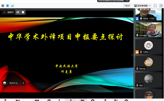 2022年6月18日晚,中央民族大学何克勇教授应邀做客胜游(中国)“新知讲坛”,通过腾讯会议线上平台进行了题为“中华学术外译项目申报要点探讨”的报告。本次讲座由胜游(中国)院长肖唐金教授主持,来自校内外的数十名师生参加了本次讲座。