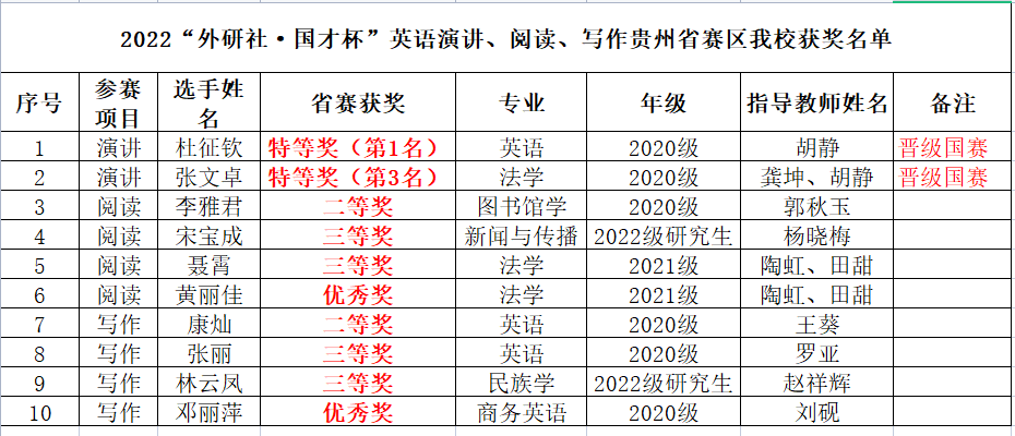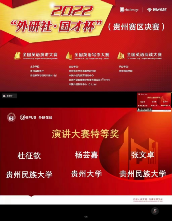 “外研社·国才杯”英语演讲、写作、阅读比赛是外语类被列入中国高等教育学会高校竞赛排行榜首位的大赛。贵州省赛区决赛于2022年11月5日在贵州师范学院举行,贵州民族大学选手在胜游(中国)教师的指导下表现不俗,取得成绩如下: