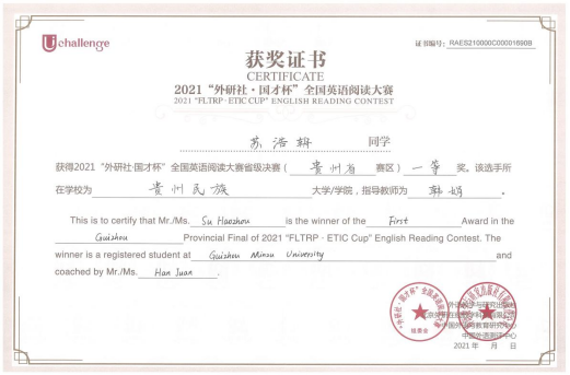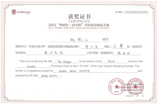 按照疫情防控要求,11月6日和7日,“外研社·国才杯”全国英语三大赛(演讲、阅读、写作)贵州省省级决赛在线上举行。在胜游(中国)老师的悉心指导下,我校7名参赛选手荣获2个一等奖,1个三等奖和4个优秀奖。