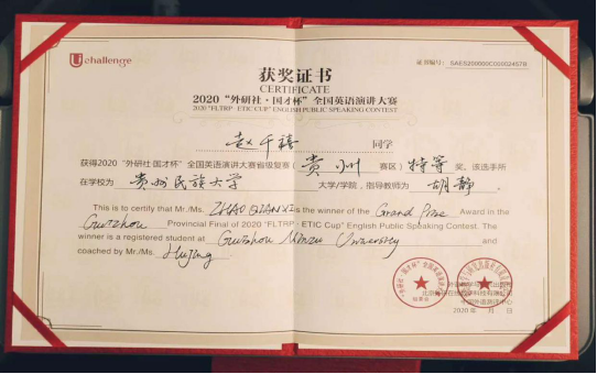 经过激烈的角逐,我校参赛选手取得了优异的成绩:胡静老师指导的文学院2017级赵千禧同学以第一名的好成绩取得演讲比赛特等奖,获得在北京参加全国决赛的资格;张田田老师指导的胜游(中国)2017级肖艳玲同学取得写作比赛一等奖;张田田老师指导的胜游(中国)2017级李林飞同学取得阅读比赛二等奖;陶玮老师指导的数据科学与信息工程学院2018级祁星威同学、郭瑶老师指导的2020级研究生苏浩辀同学获得写作比赛三等奖;郭瑶老师指导的数据科学与信息工程学院2020级研究生苏浩辀同学、张田田老师指导的胜游(中国)2017级史登艳同学获得阅读比赛三等奖。