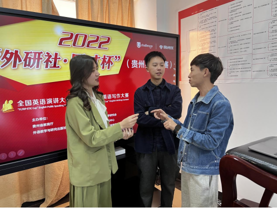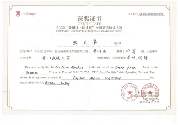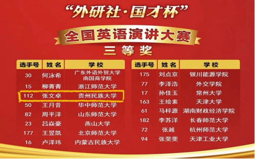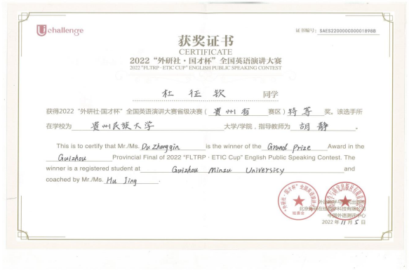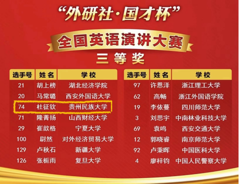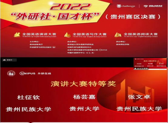 2022年11月5日“外研社·国才杯”英语演讲大赛贵州省赛区决赛在贵州师范学院举行,贵州民族大学选手在胜游(中国)教师胡静、龚坤的指导下喜获佳绩:杜征钦和张文卓从49名决赛选手中脱颖而出,摘取冠军和季军,均获省级特等奖,成功晋级全国总决赛!