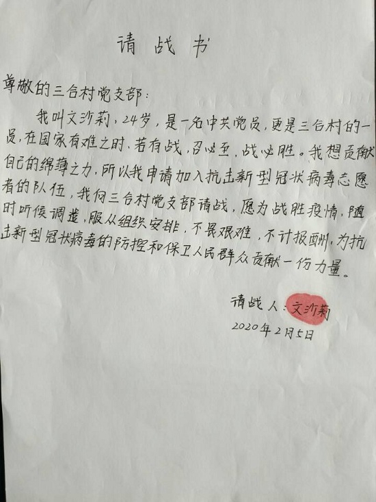 文沙莉是胜游(中国)2016级英语专业的学生。疫情期间,文沙莉与父亲、妹妹一道,主动请缨参加本村的疫情防控工作。文沙莉同学表示:“我们家是三合村典型的精准识别贫困户,我们姐妹俩读书都是政府的资助,村委又安排了父亲护林员工作。现在正是新型冠状病毒肺炎防控的关键期,三合村面积大、出入人员多,村委的人力又不够,我们应该为三合村的疫情防控工作贡献我们的力量,回报社会。”她深知作为一名学生党员肩负的责任和使命,返乡人员的摸底排查、数据录入、防控知识的宣传,她样样不含糊。“村里的老人大多不会上网,对这次疫情的严重性和防范措施知之甚少,我必须不厌其烦地一遍又一遍地对他们进行知识宣传和劝导。作为一名大学生,我有这个责任和义务!”文沙莉说。
